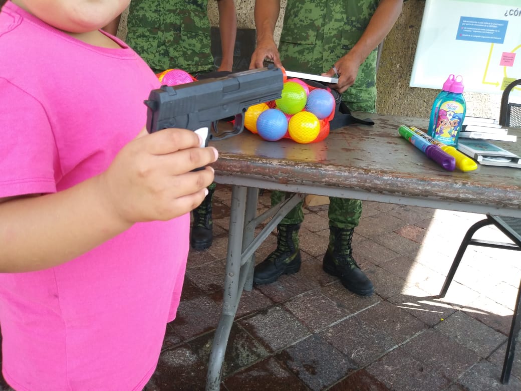 Esta escena sucedió en uno de los siete módulos de la campaña “Juguemos sin violencia” que organiza la Secretaría de la Defensa Nacional (SEDENA) en el estado de Jalisco, y que busca “canjear juguetes bélicos por juguetes didácticos que incentiven sanamente las capacidades físicas e intelectuales de las niñas y los niños” y, con ello, “contribuir a su proceso formativo en un ámbito sano y sustentado en valores”, al menos así lo señaló Fernando Enrique Méndez González, comandante de la Decimoquinta Zona Militar durante el acto inaugural.