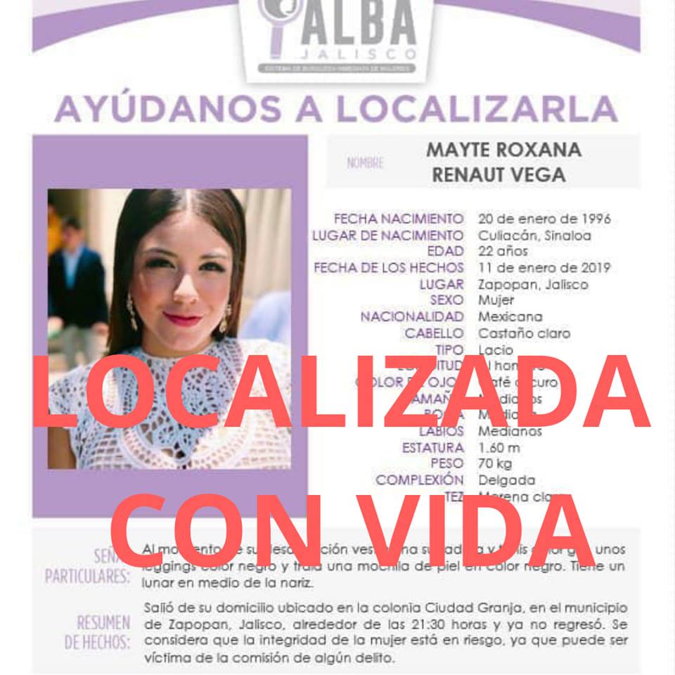 17 de enero de 2018.- Sin esclarecer el móvil de la desaparición y sin ofrecer detalles de cómo fue localizada, Protocolo Alba de Jalisco informó -a través de su redes sociales- que Mayte Roxana Reanut Vega, de 22 años, fue localizada con vida la noche del 16 de enero.