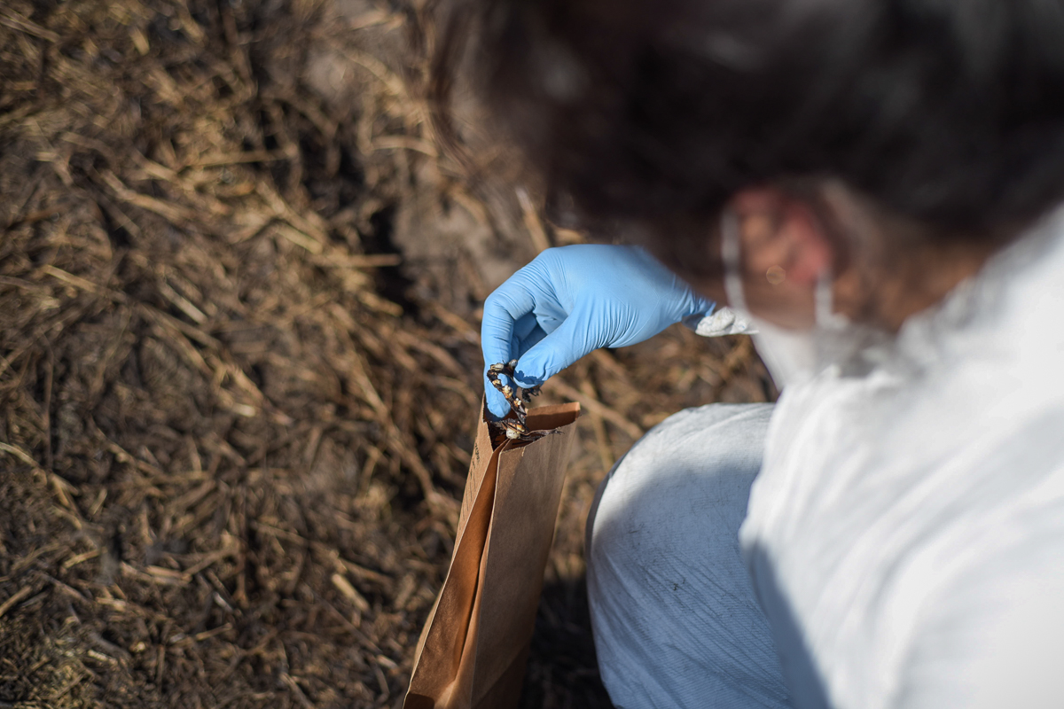 Una perito forense recoje restos óseos (dentadura) en el lugar de la explosión. Los cuerpos recuperados fueron enviados a una morgue privada en el municipio de Tula, a 15 km del Tlahuelilpan, lo que causó descontento entre los familiares.