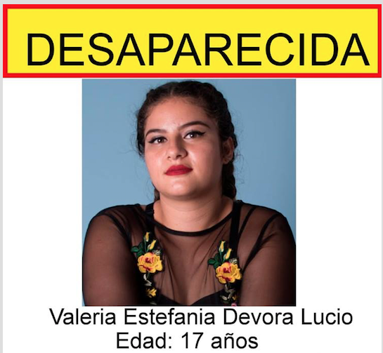 Valeria Estefanía Devora Lucio tiene 17 años y es víctima de una desaparición desde el pasado viernes 11 de enero de 2019 cuando salió de su casa en la colonia Las Huertas en San Pedro Tlaquepaque, Jalisco. Ella es una de las seis mujeres que desaparecieron dentro de la Zona Metropolitana de Guadalajara entre el 4 y el 6 de enero.
