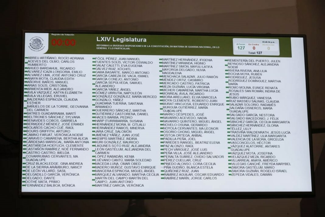 En sesión ordinaria la Cámara de Senadores aprobó de manera unánime la puesta en funciones de la Guardia Nacional bajo un mando civil. Previo a la aprobación, la madrugada de este jueves 21 de febrero las y los senadores firmaron de manera unánime el dictamen de reforma a la Constitución que establece que la Guardia Nacional tendrá un mando civil y no uno militar como han exigido ciudadanos víctimas y organizaciones. Destaca el documento un régimen transitorio de cinco años para que las Fuerzas Armadas operen en las tareas de seguridad pública y se establece que la corporación estará adscrita a la Secretaria de Seguridad y Protección Ciudadana.