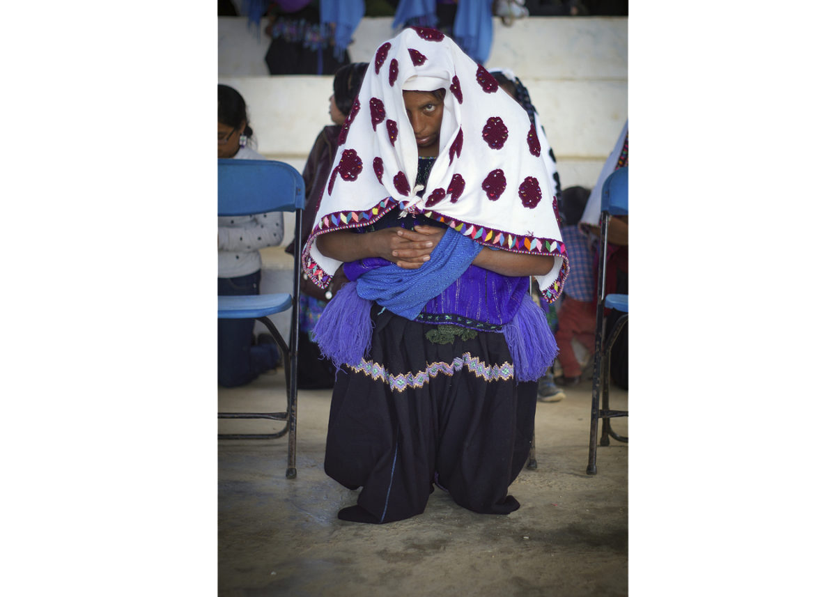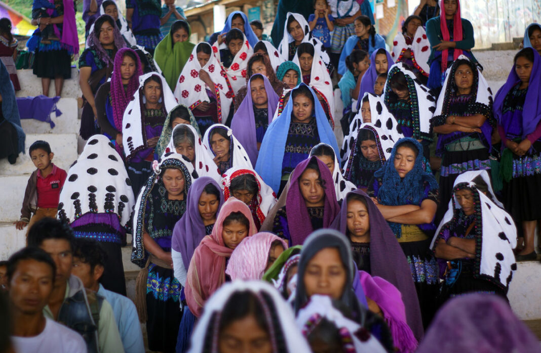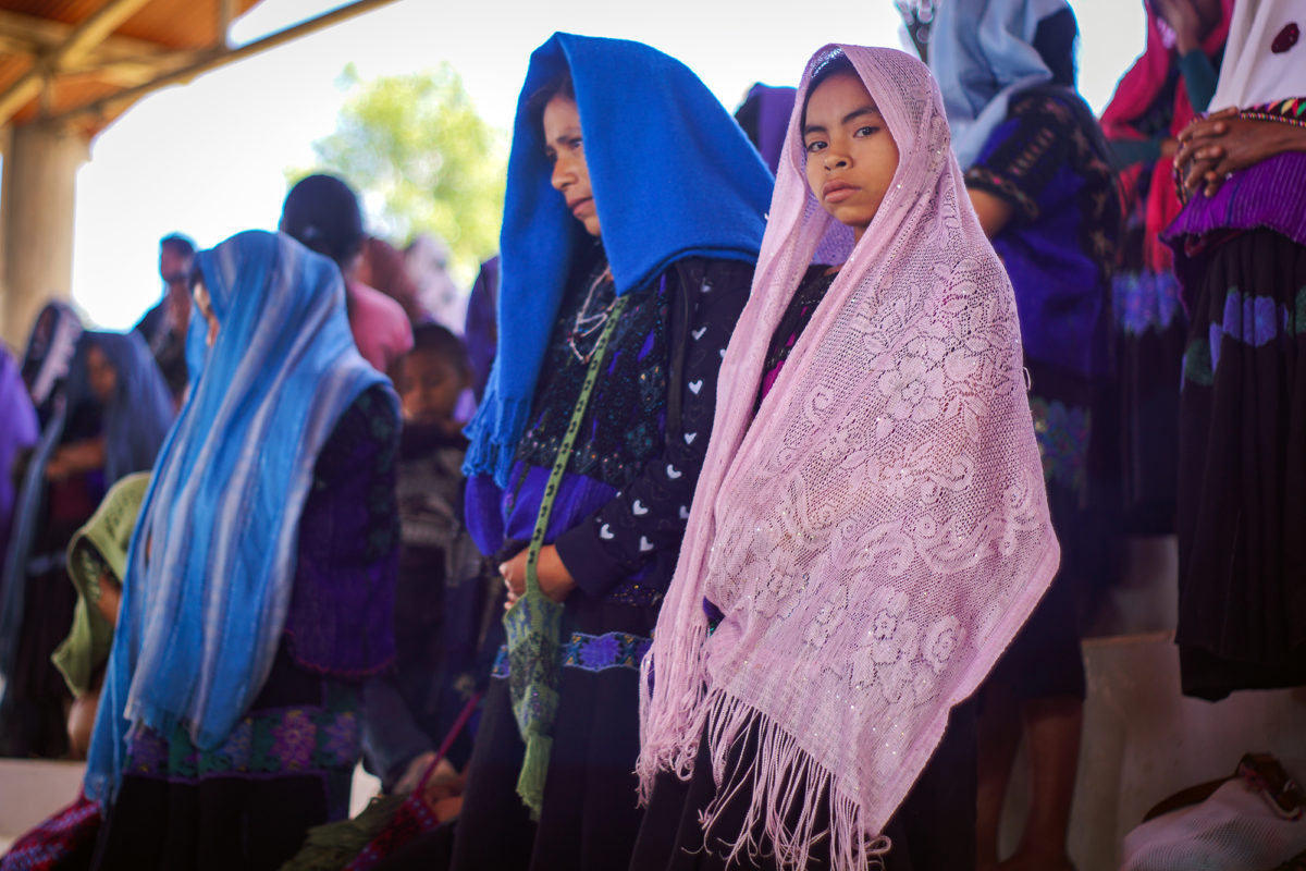 San Cristóbal de las Casas, Chiapas.- Guadalupe reza hincada junto a otras decenas de mujeres de la organización de Las Abejas durante la jornada de ayuno y oración por el Día Internacional de la Mujer. Todas portan su vestimenta tradicional, con bordados morados y rojos, sus rostros cubiertos por los rebozos azules y blancos, si no lo reflexionamos pensaríamos que son mujeres sumisas y humildes, nadie pensaría que hace unos minutos acababan de encarar con dignidad y fuerza a los militares del campamento instalado en la comunidad de Majomut, exigiéndoles que se vayan de su comunidad.