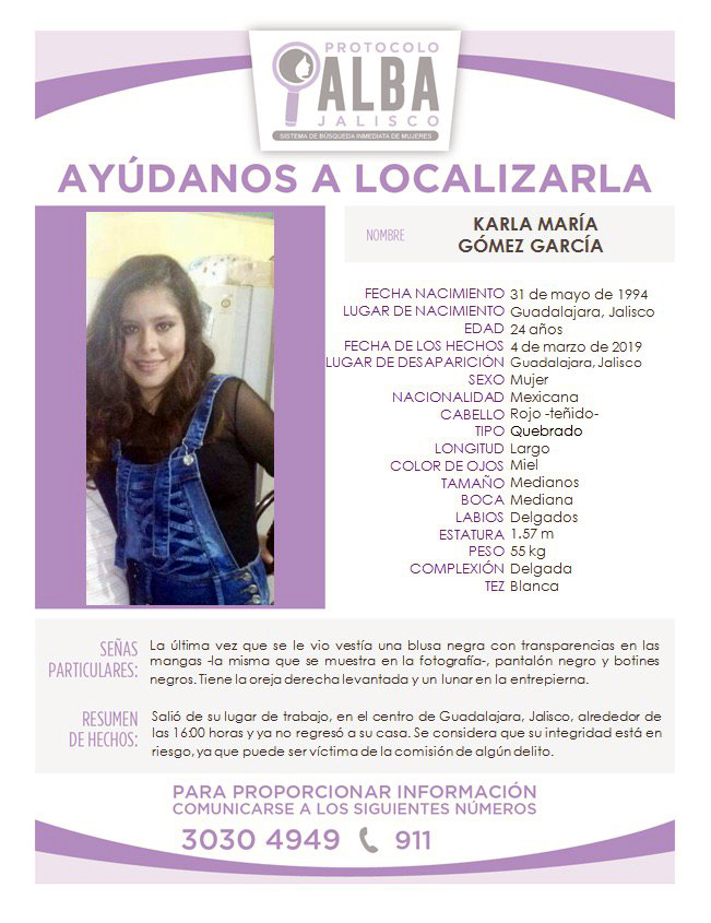 Karla María Gómez García es de tez blanca, cabello rojizo y vestía toda de color negro. Salió alrededor de la una de la tarde con dirección al banco, su familia está usando las redes sociales para buscarla. La fiscalía sí hizo la cédula de identificación pero en la familia, están sin noticias.