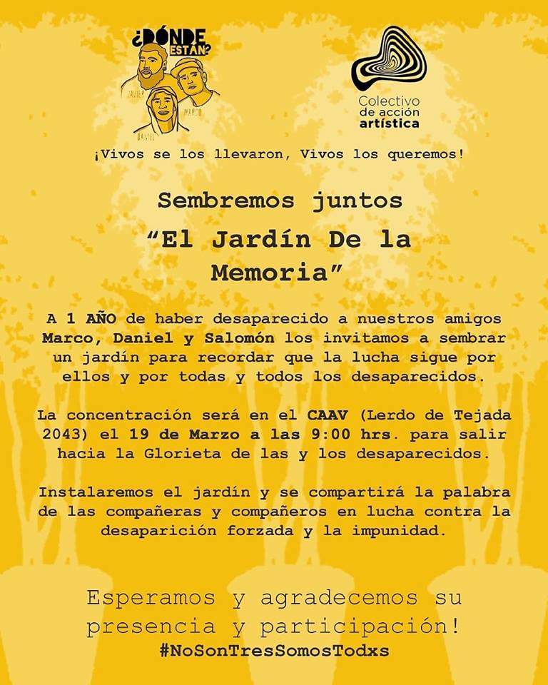 La marcha que iniciará en la escuela en la que los tres jóvenes dejaron en pausa su sueños de ser cineastas tendrá como punto final la Glorieta de las y los desaparecidos (en el cruce de las avenidas Chapultepec y Niños Héroes) en donde se sembrará “El Jardín de la Memoria”, el cual pretende ser un espacio memorial no sólo para Marco, Daniel y Salomón, sino también para todos los desaparecidos y desaparecidas de Jalisco.