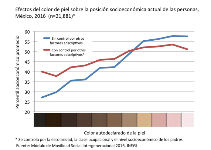 Mientras más clara es la piel, los mexicanos tienen mayor oportunidad de ser jefes, profesionistas, comerciantes y técnicos, esto de acuerdo al Módulo de Movilidad Social Intergeneracional, encuesta realizada por el Instituto Nacional de Estadística y Geografía en 2016.