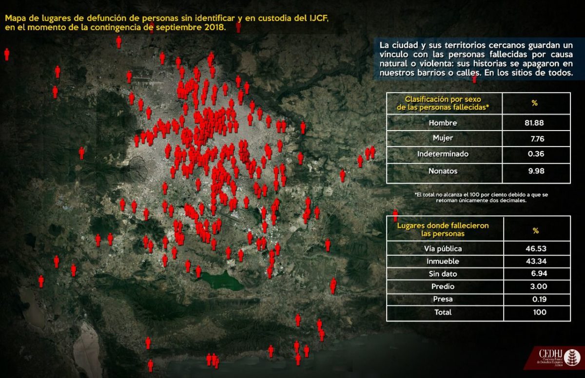 En su “Informe especial sobre el proceso de inhumación de personas fallecidas no identificadas, realizado del 22 de septiembre al 07 de diciembre de 2018 en el contexto de la contingencia provocada por la acumulación de cadáveres en el IJCF”, la CEDHJ señala que de las 605 inhumaciones que se han realizado tras la crisis forense sólo el 10 por ciento (64 personas) han sido entregados a sus familiares; añadiendo que el actuar de la FGJ y el IJCF sobre el tema ha sido altamente deficiente porque solamente: