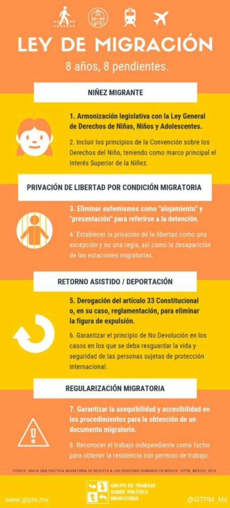 Según precisa, a ocho años de la entrada en vigor de la Ley de Migración, ésta carece de elementos vitales que permitan, por ejemplo, garantizar a la niñez migrante acompañada o no acompañada, condiciones de seguridad, bienestar, atención y protección dentro de territorio mexicano; principalmente, en los espacios donde, hasta el momento, son retenidos los menores migrantes.