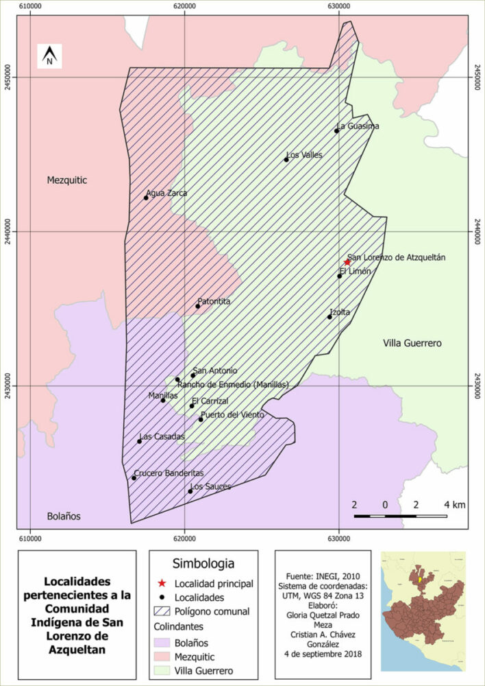 La comunidad de San Lorenzo Azqueltán, ubicada en el municipio de Villa Guerrero, se caracteriza por estar constituida por dos pueblos indígenas: los tepehuanos y wixáritari, quienes conviven y luchan por la restitución de 45 mil de las 94 mil 400 hectáreas que les pertenecen, según un título virreinal otorgado por la corona española, desde de 1733. Este territorio es básicamente todo el municipio de Villa Guerrero.
