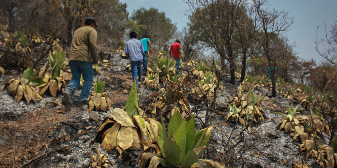 Este pasado 18 de mayo por la mañana, 15 días después del incendio, tres de los hermanos Calixto García recorrían sus tierras para hacer un recuento de las pérdidas: lomas con lunares negros, pencas de maguey carbonizadas, palmas chamuscadas, cultivos siniestrados y troncos de árboles ennegrecidos. “El maguey, el cedro, la palma son nuestras fuentes de trabajo y todo se echó a perder”, lamenta José Calixto García.