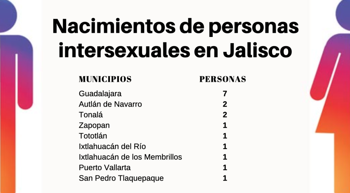 En Jalisco, han nacido 17 personas intersexuales en los recientes añoso, al menos, es la cifra que reporta la Secretaría de Salud Jalisco, a través de la solicitud de transparencia número 00275119, y cuya estadística se basa en los nacimientos registrados sólo en hospitales públicos.