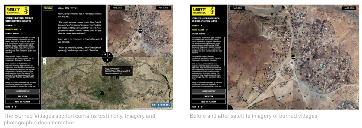 Proyecto realizado por SITU Research para la División de Crisis de Amnistía Internacional, ésta herramienta interactiva fue diseñada para ayudar a denunciar los ataques dirigidos por el gobierno a civiles en Jebel Marra, una de las regiones más remotas de Darfur, Sudán. Dichas zonas fueron localizadas producto de la combinación de tecnologías de percepción remota e imágenes satelitales. (Fuente: SITU Research).