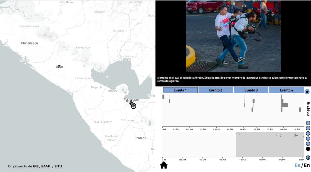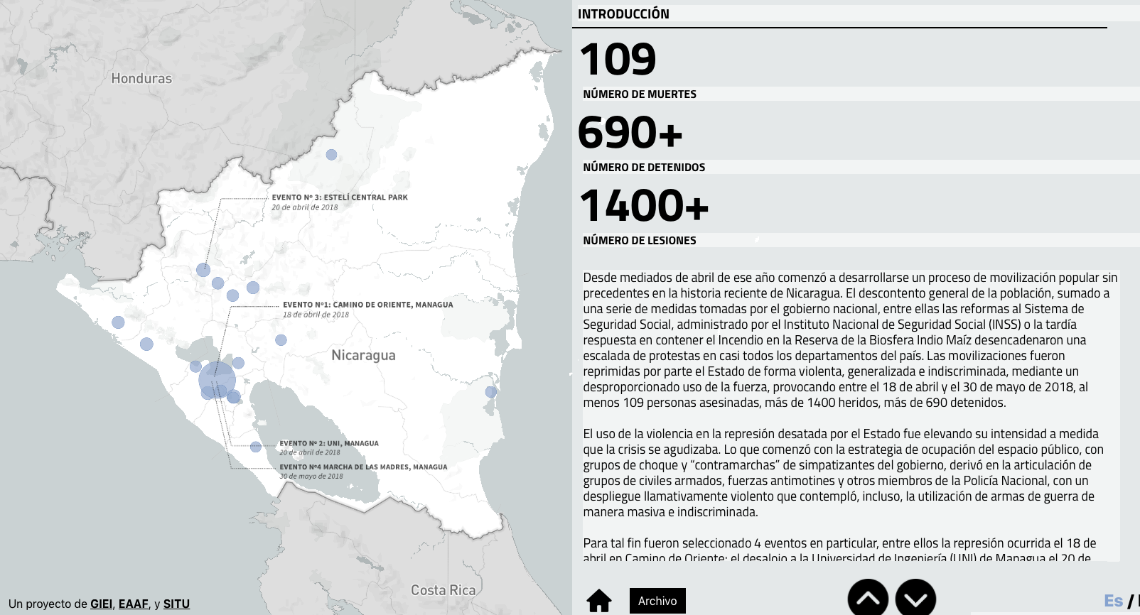 Plataforma multimedia que presenta documentación y análisis de cuatro eventos de violencia que tuvieron lugar en Nicaragua entre el 18 de abril y 30 de mayo del 2018. La plataforma funciona tanto como un archivo como una herramiento analitica, procesando un gran numero de video generados por usuarios para mejorar el entendimiento de hechos complejos (Fuente: http://gieinicaragua-cartografia-violencia.org).