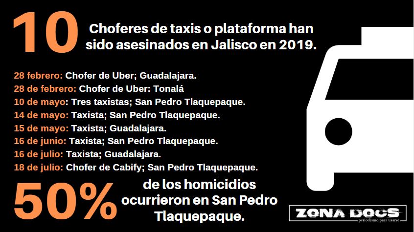 Ocho de cada diez choferes que trabajan a través de las diversas plataformas que ofertan servicios de transporte privado como: Uber, DiDi, Cabify, Easy Taxi, entre otras, han sido víctimas de algún delito en la Zona Metropolitana de Guadalajara (ZMG), así lo afirma una conductora que decidió, por seguridad, mantener su nombre en anonimato: