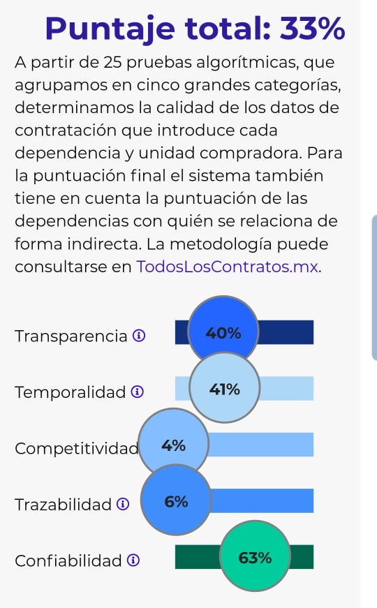 El caso de la UdeG entra en lo que Ocaranza calificó como un proliferante de la corrupción. En transparencia, la dependencia obtuvo un 40% sobre 100; respecto a la temporalidad de los contratos, fechas de lanzamiento y cumplimiento de las mismas, obtuvo un 41%; sobre la competitividad la universidad a penas fue calificada con un 4%; la trazabilidad, es decir, información sobre importes, precición de los títulos, montos contratados y modificaciones a los contratos, se calificó con un 6%.