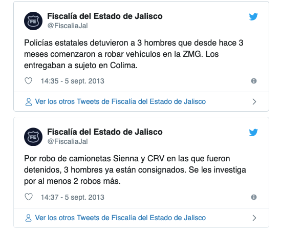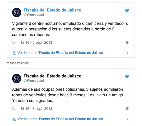 El 5 de septiembre, cinco días antes de que la ampliación de los hechos por parte de la familia de Toño se realizara, la Fiscalía comenzó a generar información que negaba que Toño y José Luis hubiesen sido detenidos, pues a través de diversos mensajes generados desde la cuenta de Twitter de la Fiscalía (@FiscaliaJal), se fue construyendo una versión oficial donde; por ejemplo, nunca hubo operativo sino fue una persecución ni jamás existieron cinco detenidos, ya que fueron simplemente tres.