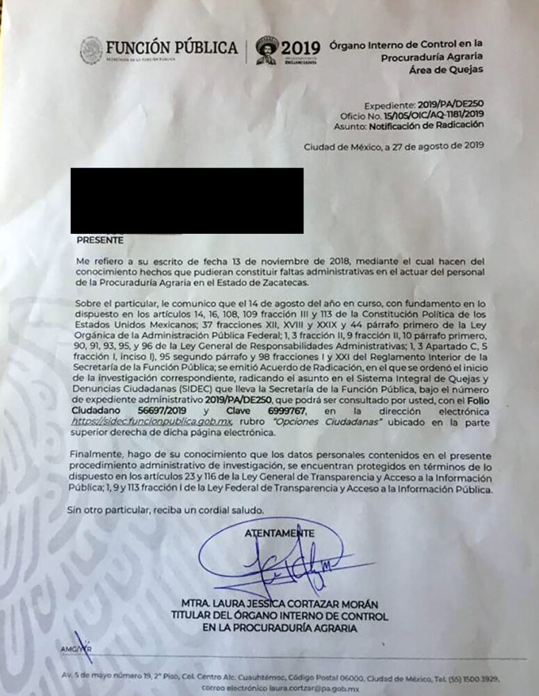 Al respecto, Grecia Rodriguez, de la Red Mexicana de Afectados por la Minería y El Observatorio de Conflictos Mineros de Zacatecas (OCMZ), dio a conocer a ZonaDocs que el pasado 27 de agosto de 2019, el Órgano Interno de Control en la Procuraduría Agraria, informó a la comunidad de Jiménez de Teúl, a través de un oficio, que se encontraba abierto el expediente 2019/PA/DE250 para iniciar con la investigación correspondiente contra personal de la Procuraduría Agraria en el Estado de Zacatecas.
