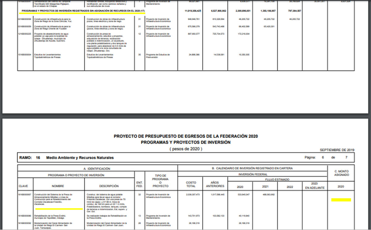 Esta decisión también puede observarse en el Tomo III, Ramo 16 del proyecto de presupuesto de la Secretaría del Medio Ambiente y Recursos Naturales (SEMARNAT), donde el Sistema de la Presa de Almacenamiento Milpillas y la Línea de Conducción para el Abastecimiento del Corredor Zacatecas-Fresnillo, Zacatecas no aparece dentro de los Programas Presupuestarios con Programas y Proyectos de Inversión del PPEF 2020.