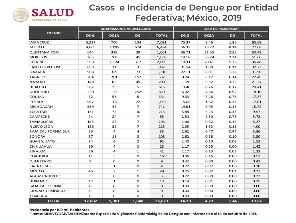 A continuación se presentan los datos emitidos por la Secretaría de Salud a nivel federal, instancia que semanalmente ha estado actualizado el “Panorama Epidemiológico de Dengue en 2019“; la información corresponde a la semana 41 (actualizada hasta el 14 de octubre de 2019):