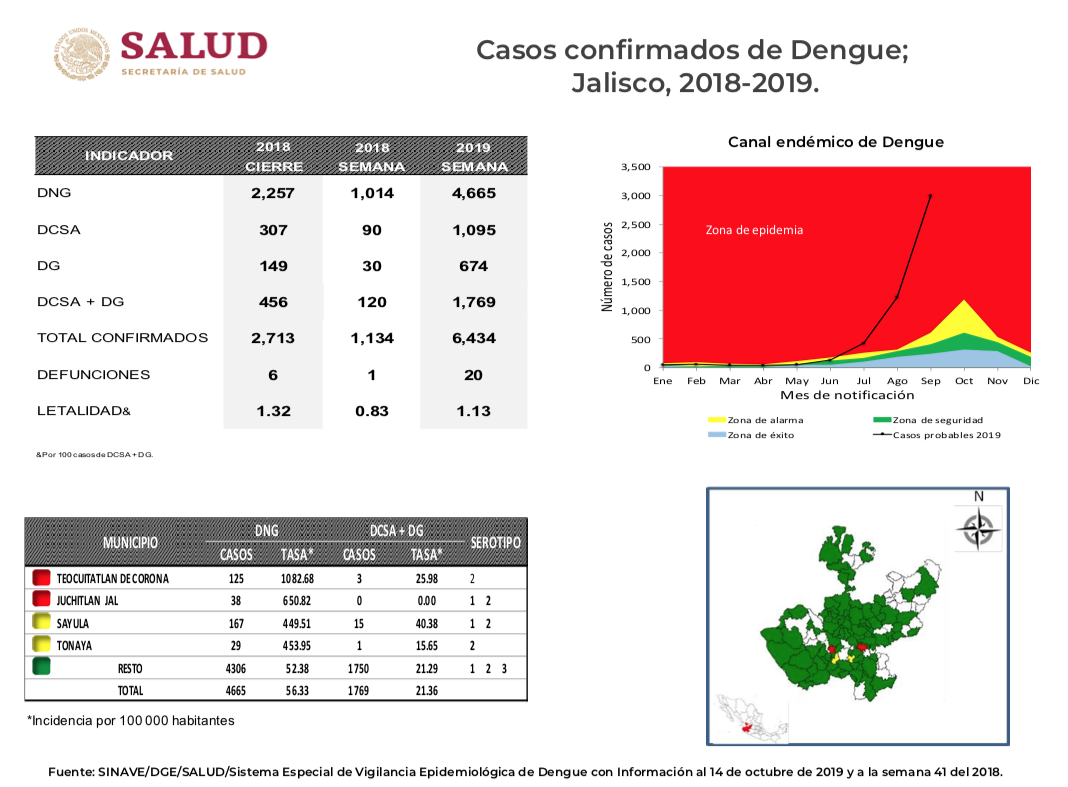 Desde el mes de junio, Jalisco cuenta con un “Aviso Epidemiológico por dengue” que el Comité Estatal de Vigilancia Epidemiológica (CEVE), hizo público frente al aumento de casos por la picadura de este mosquito dentro de cuatro Jurisdicciones Sanitarias en el estado: Guadalajara; Zapopan; Tonalá; y Tlaquepaque. Hasta ahora, Jalisco es el segundo estado en el país con mayor número de casos de dengue; 6 mil 434 hasta los primeros días del mes de octubre; esto de acuerdo a los datos que también ha generado al Secretaría de Salud a nivel federal.