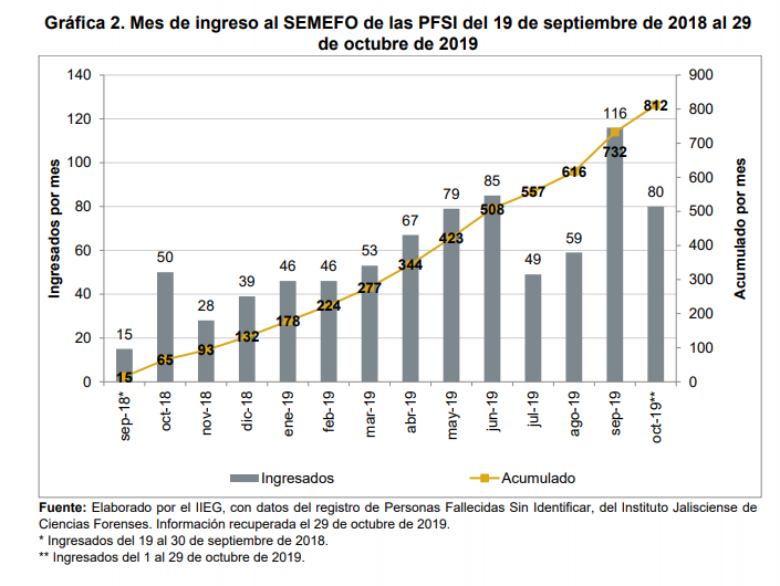 El registro de Personas Fallecidas Sin Identificar (PFSI) que presentó el Gobierno de Jalisco sólo contiene la información de 805 cuerpos de personas no identificadas que mantienen en resguardo desde el 19 de septiembre de 2018; sin embargo, esta base de datos que da cuenta de los rasgos individualizantes de identificación de cada cuerpo como: prendas, tatuajes, señas particulares, género, edad: así como la fecha de ingreso y el número de identificación del registro único de identificación; sólo representan una quinta parte de los 4 mil 060 cuerpos de personas sin identificar que tanto la Fiscalía del Estado Jalisco (FEJ) como el Instituto Jalisciense de Ciencias Forenses (IJCF) tiene bajo su resguardo desde 2006.