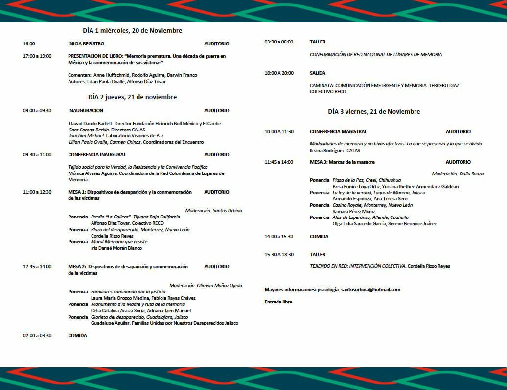 La jornada de tres días incluye: conferencias magistrales, mesas de diálogo, talleres, la presentación del libro “Memoria prematura. Una década de guerra en México y la conmemoración de sus víctimas” y la conformación de la Red Nacional de Lugares de Memoria. Los eventos se llevarán a cabo en el Centro Universitario de Ciencias Sociales y Humanidades (CUCSH) sede La Normal, dentro del Auditorio Adalberto Navarro. Organizan: Laboratorio Visiones de Paz del CALAS, Fundación Heinrich Böll y el Colectivo RECO.