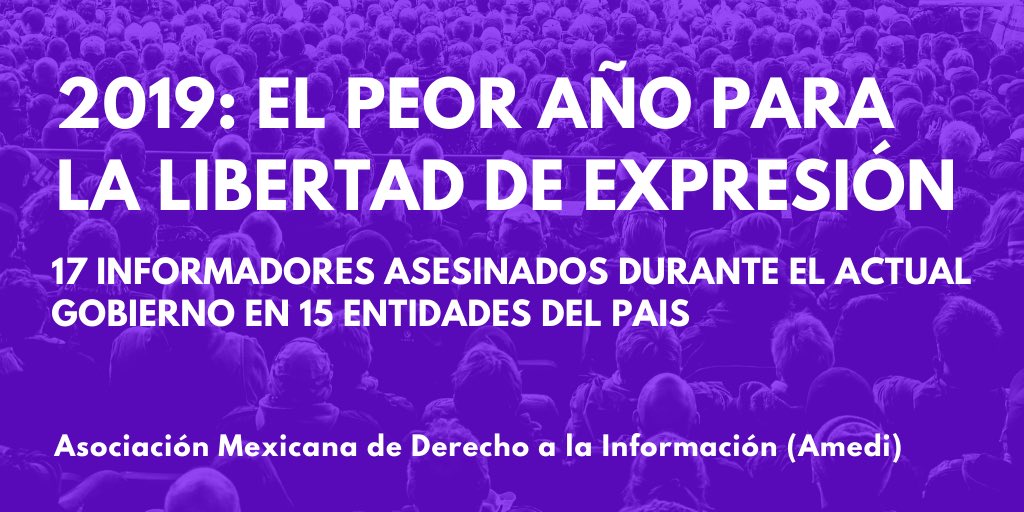 “Silenciar a un periodista es impedir el derecho a la información de los ciudadanos” acusó en un comunicado la Asociación Mexicana de Derecho a la Información (Amedi); y es que precisan que, “sin que haya concluido 2019, ya se convirtió en el año más violento para los periodistas y la libertad de expresión en México”. De acuerdo con sus registros, 17 comunicadores, comunicadoras y periodistas han sido asesinados durante la administración federal de Andrés Manuel López Obrador, mientras que, 15 de éstos han sucedido durante el año 2019.