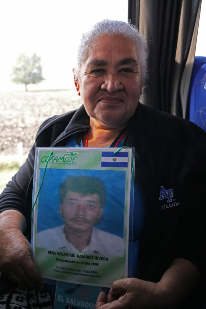 Con la fotografía de su hijo colgada al cuello, nos platica que su muchacho, René Wilmoris Ramírez Rivera desapareció en el año 2003, luego de salir huyendo de El Salvador por la violencia y tras permanecer en Guatemala esperando el momento perfecto para cruzar a México.