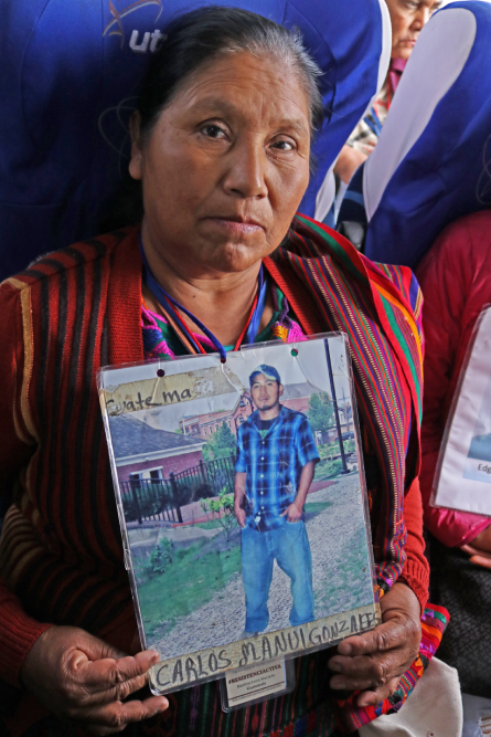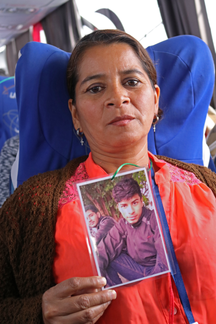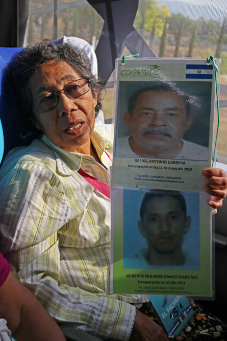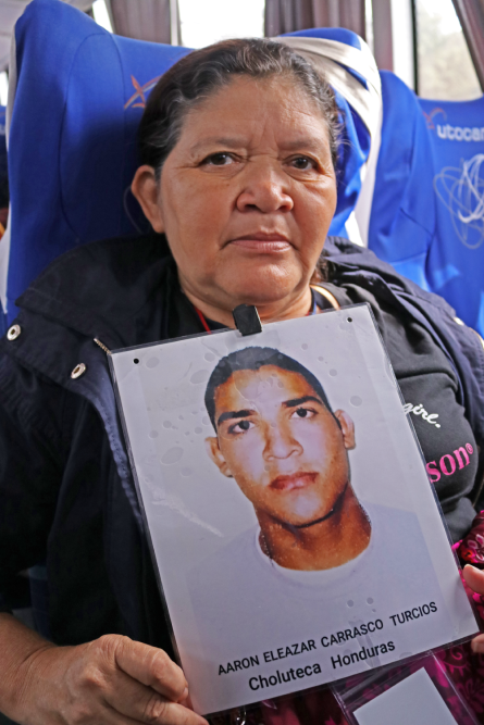 Doña Araceli, posa para nuestra fotografía, pero antes, nos pide que también se la tomemos sosteniendo la ficha de otro de los desaparecidos de su país; dice que aunque no es su hijo, también le está buscando.
