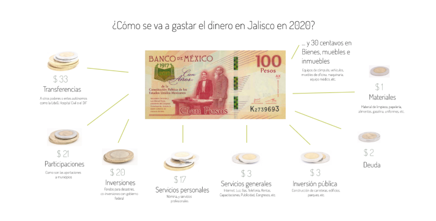 Siguiendo la analogía es posible saber que de estos 100 pesos, 33 se transfieren a organismos autónomos (por ejemplo, la Universidad de Guadalajara) y 17 pesos se destinan para solventar “gastos personales”, cantidad de recurso que supera a gastos como: servicios generales, inversión pública, deuda pública, materiales y adquisición de bienes e inmuebles.
