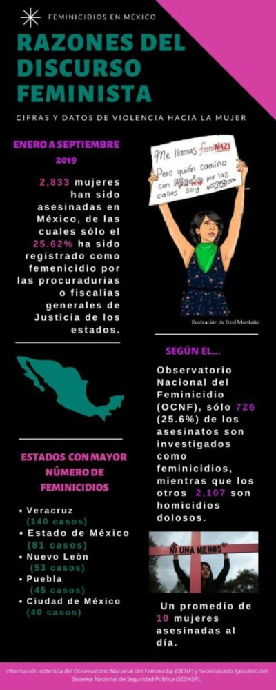 Según datos del Secretariado Ejecutivo del Sistema Nacional de Seguridad Pública (SESNP), de enero a finales de septiembre del 2019, se registraron 2 mil 833 mujeres asesinadas en México, en promedio 9.5 mujeres al día. De esa cifra sólo 726 asesinatos fueron tipificados como feminicidios de acuerdo con el Observatorio Ciudadano Nacional del Feminicidio (OCNF) México.