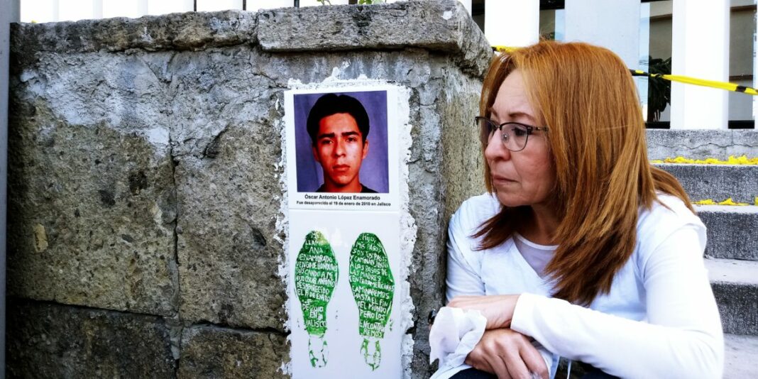 Ana Enamorado, madre centroamericana que busca a su hijo, Óscar Antonio López Enamorado, desaparecido en San Sebastián del Oeste, Jalisco desde el año 2010, se pronunció este miércoles 22 de enero en la Fiscalía de Derechos Humanos del Estado de Jalisco, en la ciudad de Guadalajara. Apelando a su derecho a la memoria y acompañada de aliados, organizaciones y amigos, instalaron en uno de los muros principales de las instalaciones públicas, un par de losetas con la fotografía del rostro de su hijo, junto con las huellas de sus zapatos teñidas de color verde.