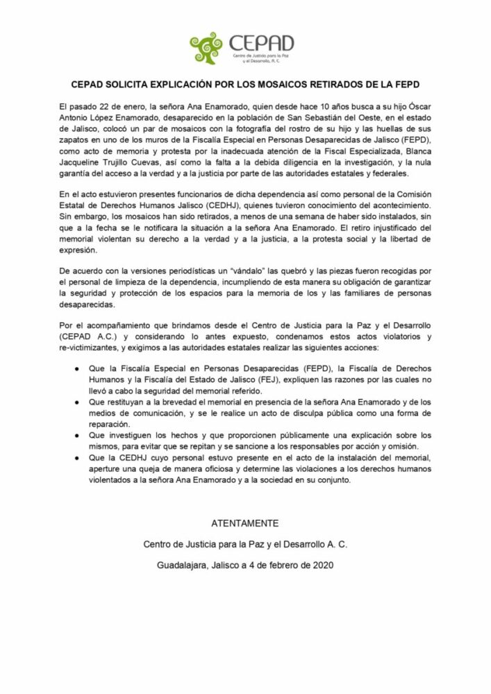 Por ello, han condenado estos actos que consideraron “violatorios y revictimizantes” y han hecho una serie de exigencias a la Fiscalía del Estado de Jalisco y a la Comisión de Derechos Humanos de Jalisco que incluyen: la explicación de los hechos, la reinstalación del memorial, un acto de reparación que incluya el ofrecimiento de una disculpa pública y el inicio de una queja oficiosa.
