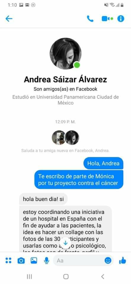 Ella me dice que esta amiga está organizando la campaña, que hay una remuneración económica de 12 mil pesos. Yo lo pienso en ese momento por lo del cáncer, porque tengo una conocida o personas cercanas; me tocan estas fibras emocionales, le digo que me parece bien y me entrega el contacto de Andrea, la agrego y me empieza a dar más especificaciones. Me dice cómo son las fotografías, me dice que son con tu pecho descubierto, de frente, de perfil, de espaldas y luego me pide fotografías más explícitas después de que se las mando. Yo dudo y voy y le pregunto a Ileana (perfil de Facebook hackeado) que si esto también le pasó a ella, que me están pidiendo este tipo de fotos más explícitas, y me dice que sí, que es normal, que a ella se las pidieron y que confíe.