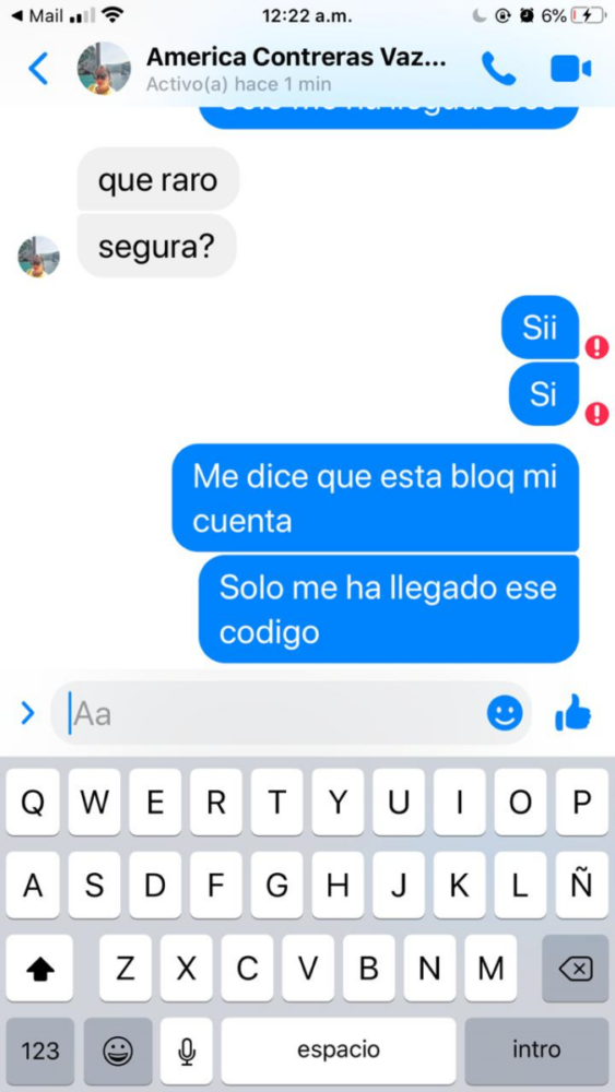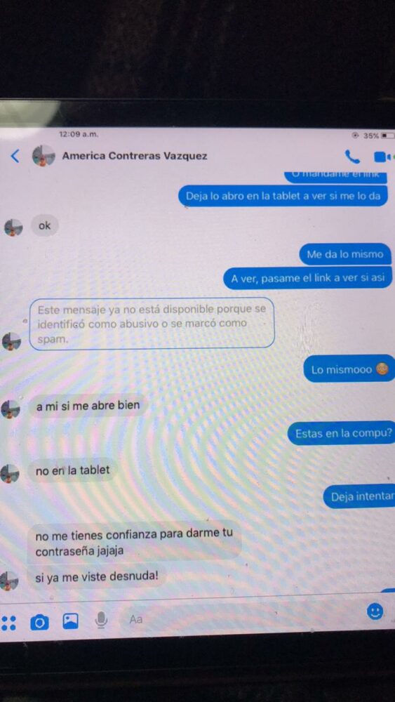 “No me tienes confianza para darme tu contraseña jajaja si ya me viste desnuda!” le escribió el hacker que está usurpando la identidad de América. Finalmente, Cecy acepta. En unos cuantos minutos se da cuenta de que su perfil está bloqueado y que a su correo ha llegado un mensaje donde le notifican que “una app sospechosa” estaba intentado acceder a su cuenta, con dirección IP en Cruz, Mendoza, Argentina.