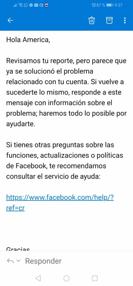 “Revisamos tu reporte, pero parece que ya se solucionó el problema relacionado con tu cuenta”, dice el e-mail que le hicieron llegar.