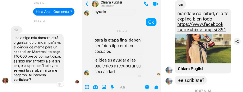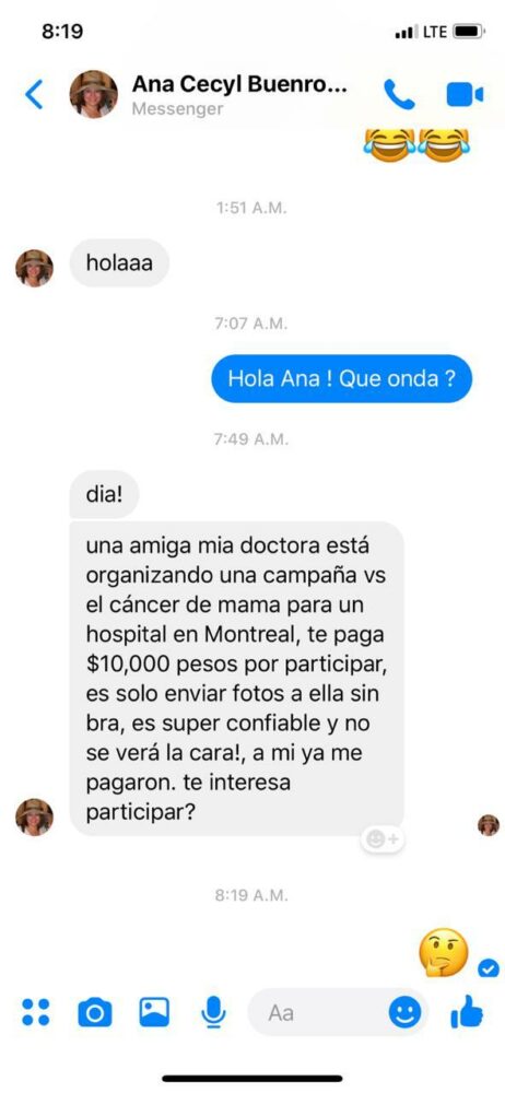 “holaaa, holaaa, una amiga mia doctora está organizando una campaña vs el cáncer de mama para un hospital de Monteral, te paga $10, 000 pesos por participar, es solo enviar fotos a ella sin bra, es super confiable”…