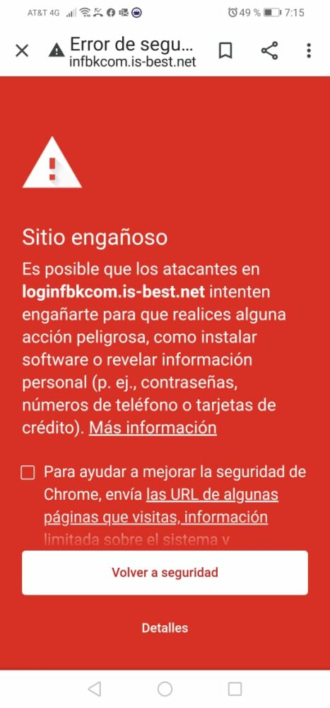 Si bien, su navegador le indicaba que se trataba de un “Sitio engañoso” y que se habría “detectado un intento de suplantación de identidad”, consideró que tal vez se trataba de un error. América se lo hizo saber a la doctora y ésta le pidió que le enviara sus datos a su familiar para que él le registrara y pudiera continuar con el proceso de pago. Lo hizo y de inmediato su perfil dejó de pertenecerle. Cambiaron su contraseña, su correo y, si bien, ha denunciado a Facebook la usurpación de su identidad, de nada ha servido, puesto que, la compañía “no reconoce” que exista un problema con el perfil.