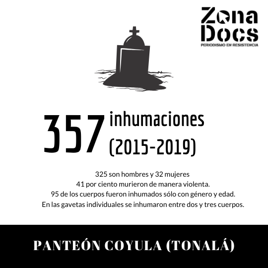 Conformes los datos obtenidos por este equipo de investigación, en ese panteón 85 personas que fueron inhumadas no aparecen en los registros de la FEJ y el IJCF. Incluso, esta dependencia en una última solicitud de transparencia (IJCF/UT/1084/2019), aseguró que sólo tiene conocimiento 95 inhumaciones en el panteón de Coyula.