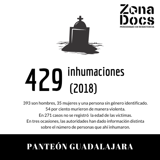 Dentro del Panteón de Guadalajara, conforme a la solicitud IJCF/UT/1437/2018, se produjeron 429 inhumaciones de personas fallecidas no identificadas; sin embargo, en la revisión que se hizo del lugar se contabilizaron sólo 383 gavetas ocupadas.