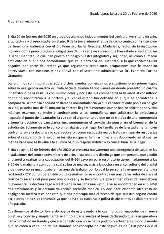 Estudiantes del Centro Universitario de Artes, Arquitectura y Diseño (CUAAD) de la Universidad de Guadalajara (UdeG), denunciaron a través de un comunicado importantes negligencias médicas que han puesto en riesgo la vida de una alumna. De acuerdo con el documento, ésta, es una situación que se deriva de la no contratación del Seguro contra accidentes para la comunidad estudiantil y/o lo que podría ser: el desvío de los recursos destinados para esta tarea; ya que, según han denunciado, la póliza no ha sido cubierta desde diciembre de 2019 – a pesar de que cada alumno paga 150 pesos al semestre para cubrir este rubro-.