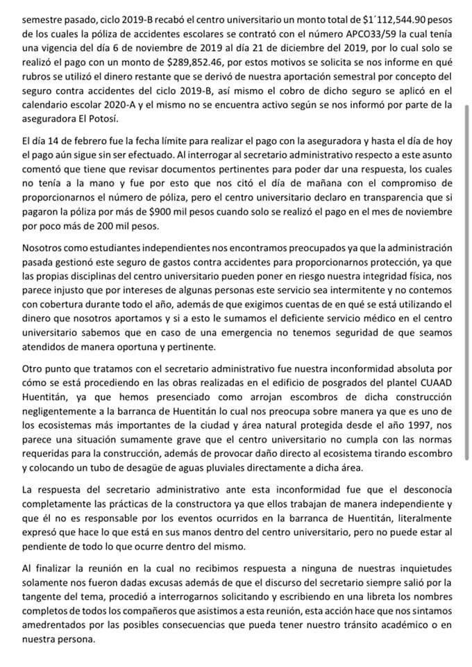 “(El) semestre pasado, Ciclo 2019-B recabó el centro universitario un monto total de $1,112,544.90 pesos, de los cuales la póliza de accidentes escolares se contrató con el número APCO33/59, la cual tenía una vigencia del día 6 de noviembre de 2019 al 21 de diciembre de 2019, por lo que sólo se realizó el pago con un monto de $289,852.46. Por esos motivos, se solicita se nos informe en qué rubros se utilizó el dinero restante que se derivó de nuestra aportación semestral por concepto del seguro contra accidentes del ciclo 2019-B, así mismo el cobro de dicho seguro se aplicó en el calendario escolar del ciclo 2020-A, y el mismo no se encuentra activo según se nos informó por parte de la aseguradora El Potosí”, señala el comunicado de los estudiantes.