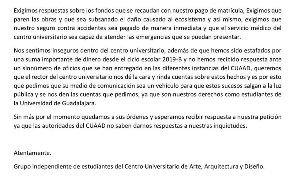 Finalmente, hicieron mención sobre la falta de respuestas por parte de las autoridades universitarias, respecto a las obras del edificio de posgrados del centro universitario, en donde, según han presenciado los alumnos, se han arrojado los escombros de la construcción hacia la Barranca de Huentitán, uno de los ecosistemas más importantes de la Zona Metropolitana de Guadalajara, y Área Natural Protegida desde 1997.