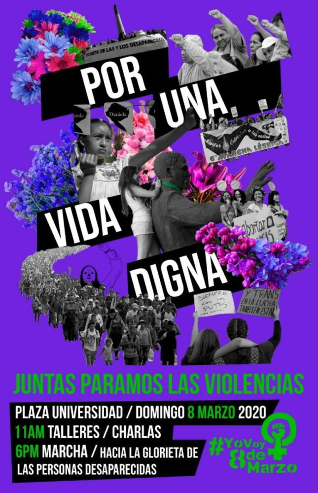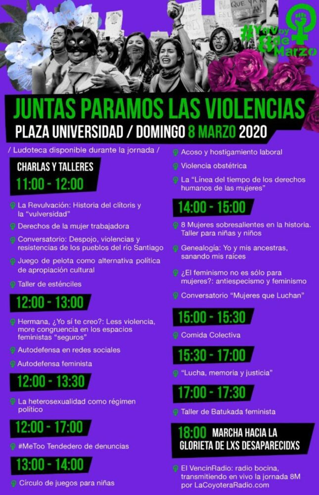 “Queremos que este 8 de marzo se convierta en una jornada de charlas y talleres donde juntas, PAREMOS las violencias y tomemos las calles con una marcha encabezada por el contingente de la batucada y las familias” anunció a través de un comunicado la Asamblea YoVoy8demarzo a unas semanas de que se conmemore el Día Internacional de las Mujeres; y, con éste, la jornada de actividades feministas y sororas que buscan visibilizar y desnaturalizar el contexto hostil que rodea la vida de las mujeres en el país, acompañar a quienes han sido sus víctimas y pugnar por un alto a las violencias machistas y feminicidas.