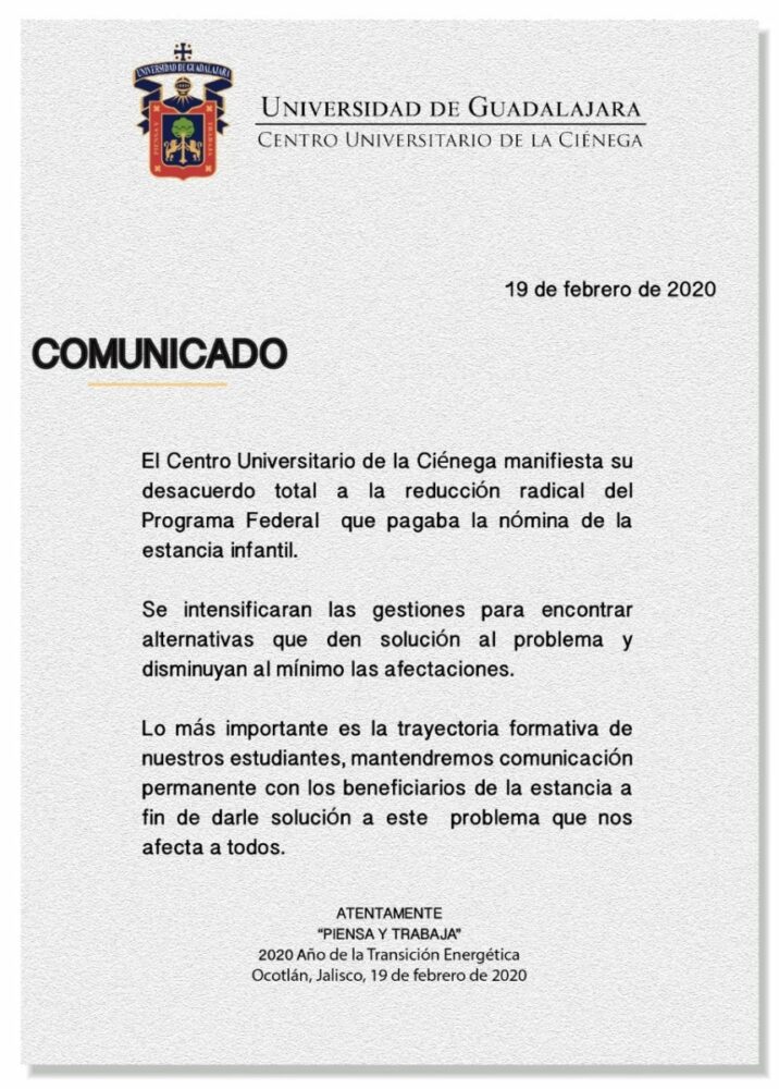 El 19 de febrero por la noche el Centro Universitario de la Ciénega emitió un comunicado en su cuenta de Facebook en el que aseguraron que buscarán alternativas para disminuir las afectaciones, además, afirmaron que mantendrán la comunicación permanente con las y los beneficiados de la estancia infantil.
