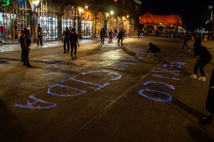 Artistas hacen arder la frase “México Feminicida” frente al Palacio de Gobierno de Jalisco