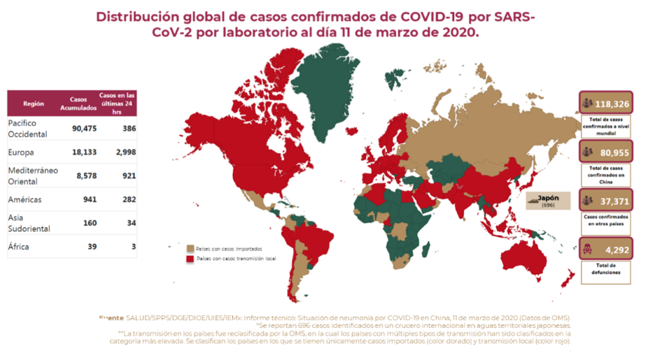 En el país, la Secretaría de Salud ha informado que en México sólo hay 12 casos confirmados (el último caso no entró en el corte informativo del 11 de marzo); a nivel mundial, al 04 de marzo de 2020, se han reportado 118 mil 326 casos confirmados de COVID-19 y 4 mil 292 defunciones, lo que implica una tasa de letalidad global del 3.62%.