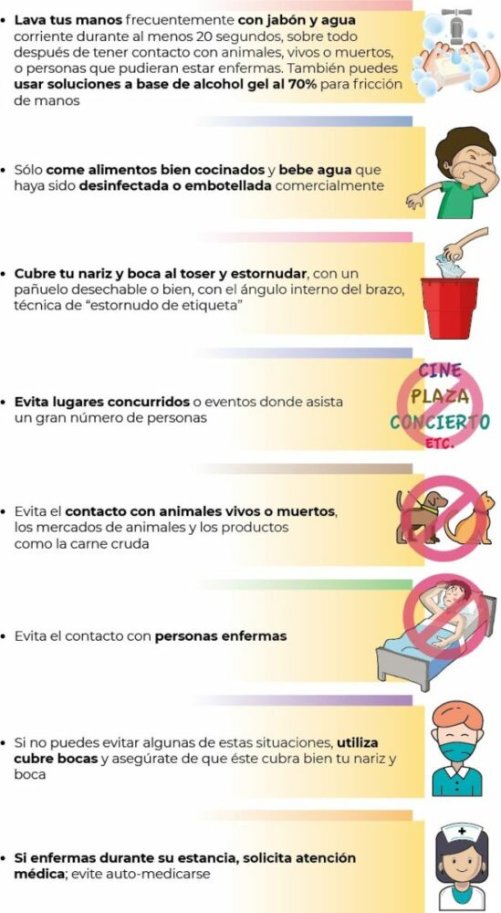 Sobre los consejos y medidas que debemos de tomar para combatir cualquier riesgo de contagio están: el lavarse, mínimo, por 20 segundos las manos; evitar saludar de mano, y, en general, todo tipo de contacto físico; así como estar a un metro de distancia de cualquier persona enferma de gripa.