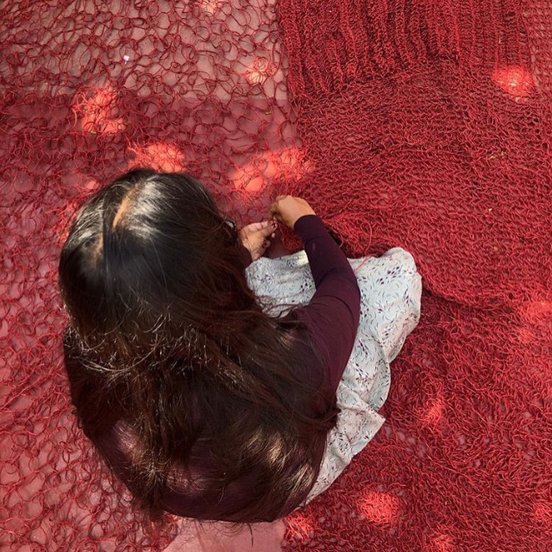 Durante dos meses decenas de personas trabajaron, bajo la coordinación del Colectivo Hilos, para crear la instalación de un tejido que simboliza: “la sangre derramada por los feminicidios y las desapariciones que han ocurrido en Jalisco”.