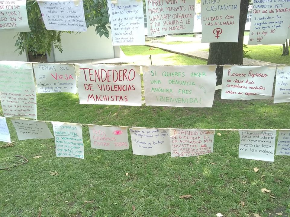 “Se la voz de aquellas que no pueden hablar”; “No te hagas, anota a tus amigos”; “Hecho en derecho solapadores de violencia”; “El buitreo es acoso”; “Ninguna Universidad puede hablar de prestigio si tolera y encubre a acosadores” son algunos de los miles de mensajes que hasta el día de hoy claman justicia en los “tendederos de denuncias” de la universidad pública del estado de Jalisco.