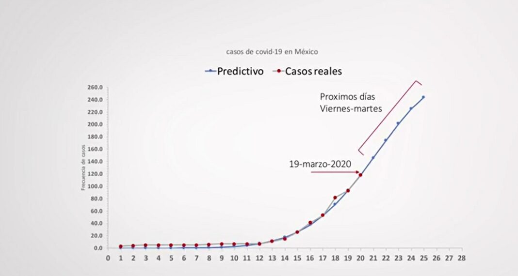 La Sala de Situación en Salud de la UdeG, desarrolló el pasado 12 de marzo un modelo predictivo, creado a partir del análisis de datos de la evolución del virus en China y apoyados de herramientas informáticas que estimaban que para el 20 de marzo existirían 118 casos en el país; sin embargo, esta cifra se disparó llegando a 163 casos de personas infectadas para esta fecha.